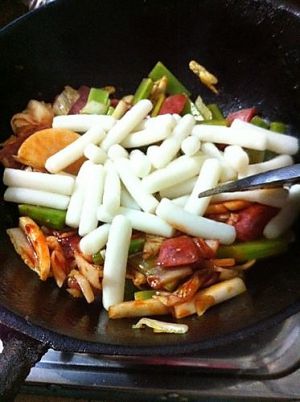 将控水的年糕条倒入,根据自己口味加入甜辣酱,翻炒均匀。