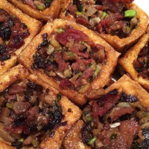 腊肠、蘑菇、西葫芦切丁,葱切碎。放入盐、鸡精、蚝油、橄榄油or香油拌匀。