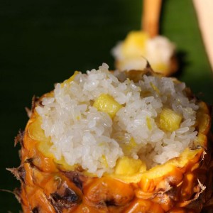 热锅放入适量油,放入洗净的糯米、放入菠萝丁、最后加入调味料拌炒均匀,然后盛入菠萝盅里。