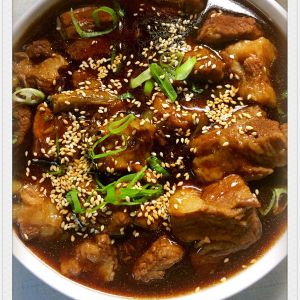 锅中烧油,放入冰糖,将排骨均匀地炒上糖色