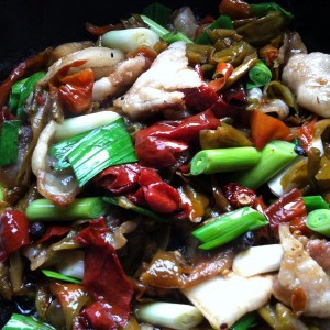 带皮五花肉切薄片,蒜苗切段,开水烫过的辣子皮切小块。