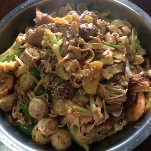 先放油,量多的话油多点,在放猪肉,土豆片,虾,在放入香锅料翻炒,炒好之后放入沥干的蔬菜翻炒