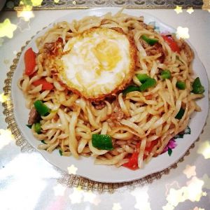 鸡蛋过油煎成荷包蛋,摆放在炒好的切面上,OK 开吃!