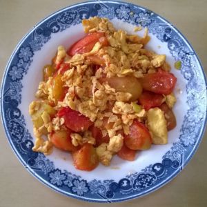炒出红浆的程度放入鸡蛋一起炒,临出锅放味精