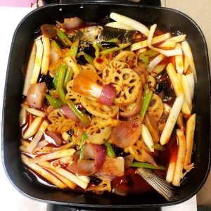 加配菜:藕片 西芹 洋葱 土豆条 炒香