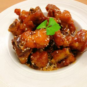 倒入炸制好的排骨炒到上糖色,表面金黄即可