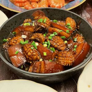 因为鲍鱼长时间烹饪肉质会变老,所以将鲍鱼带着酱汁捞出备用、也可以入味;