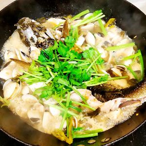 酸菜鱼大滚约1-2分钟,就可以在鱼的两边放上白贝