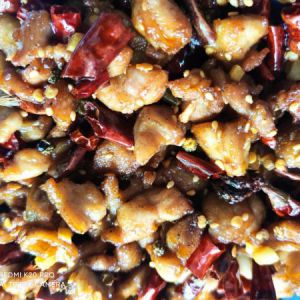 锅中留余油,小火,放入姜蒜、花椒、八角,炒出香味,放干辣椒,炒至辣椒变色放入鸡丁。
