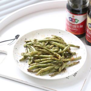 空气炸锅铺上油纸,倒入四季豆,刷少量油