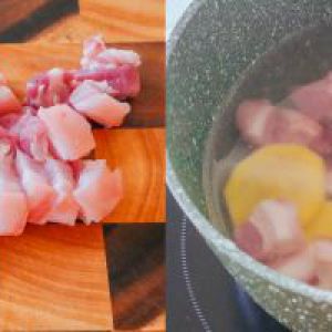 五花肉切小块,冷水放入锅中,丢上葱姜,然后开火煮,把血沫都煮出来。