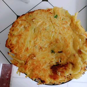 锅中加入少许花生油,放入一勺搅拌好的土豆和面粉的混合物,用刀铲压平,烙至两面金黄,出锅