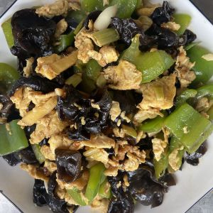 青椒洗净切块,木耳泡发绰水两分钟,葱姜蒜切碎,鸡蛋打成蛋液