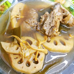 把焯好的排骨和仙贝,藕片,虫草花一起放入,加5—6片姜,功能键选择老火汤,慢炖4小时…………