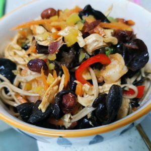 把提前泡好的黑木耳和其他蔬菜一样分别放水烧开汆熟;虾仁放入点胡椒粉,料酒、盐、淀粉搅拌后锅里热油炒熟。所有配菜放入大碗里。