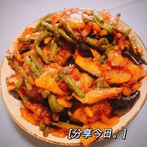 将油炸好的土豆,茄子,豆角一起放入锅内翻炒然后加入三勺鲜酱油,一勺蚝油,一勺糖再次翻炒加入少量清水稍煮片刻(记得尝一下咸淡,可以放一些盐进行增味)
