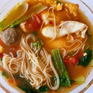 西红柿炒烂后加入十三香,加开水,放入煎蛋和面条,面条煮差不多加入小白菜和盐,