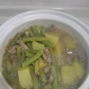 加入豆角和土豆,一碗水,一勺盐,一勺生抽,大火烧开后盖锅盖转小火慢炖
