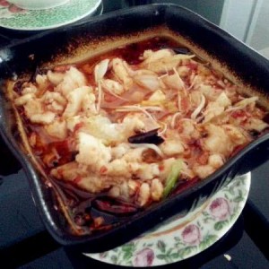 重新起锅,加适量水烧开,再加入三饭勺白家水煮鱼调料,待快烧开时将鱼片放入汆熟(大概六七秒的样子)。