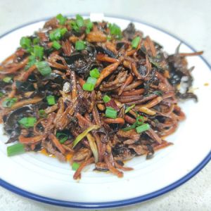 下胡萝卜丝、木耳丝翻炒两分钟左右;