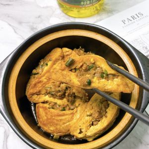 将瘦肉轻轻塞入豆干中,再放入锅中。倒入适量清水,煮开。
