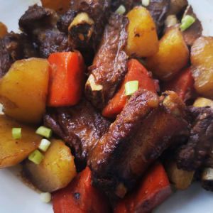 将排骨用清水浸泡1-2小时,期间用流动水冲净血水备用,土豆胡萝卜切块备用