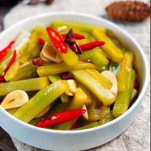 准备食材和工具:莴笋2根、40克冰糖、少许花椒、3个八角、适量清水、50克乳酸菌老陈醋、小鲜侣调味汁、100克酱油心生、小米辣、蒜片