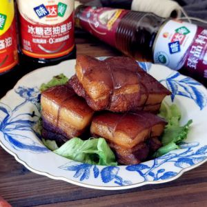 1、五花肉要选择块大一些的方肉,肉质要肥瘦相间的。用到的调味料并不复杂,味达美的这款冰糖老抽,是独家了冰糖熬制的,上色红润亮泽
