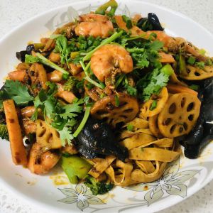 锅中放油,把葱姜蒜放入炒香,把香辣酱放入,再把虾炒熟,最后把焯水的食材放入锅中翻炒两分钟,撒上香菜出锅啦