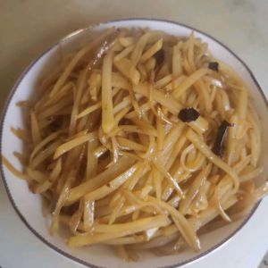 出锅前再来少许陈醋和鸡精,翻炒均匀出锅即可。一盘酸辣开胃的土豆丝就做好了