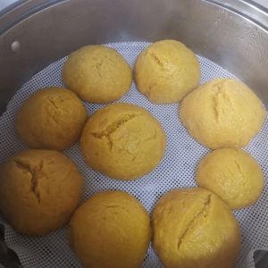 面团团成小圆球,隔开放置,放入蒸锅,水开蒸15分钟,然后闷两分钟