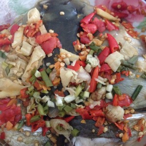 过一个小时,把鱼头流出来的酒倒掉,放剁椒,把鱼头里外全摸一边,在鱼头最上面放点生姜 葱,一点鸡精