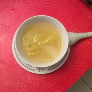 将调好的汤用鸡胸打成沫放入调好的汤中再开一次 汤就清 澄清汤去掉残高汤调味加入菜心即可