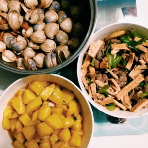 洗净花蛤,开水焯至壳张开。花蛤捞出放入冷水。