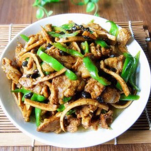 加入切成细丝的青椒丝,豆干丝略炒出锅即可。