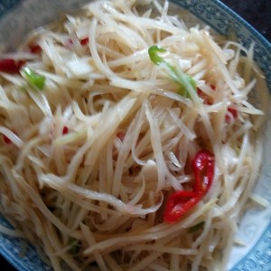 花椒粒捞出不要,放葱丝、青红椒、土豆丝,(土豆丝泡洗的越清爽,炒好了越清脆)翻炒,放醋,当然各种醋都可以,大家不用纠结,继续翻炒~