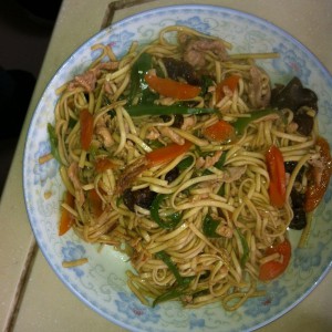 肉丝下锅炒 放酱油 盐 糖 料酒 胡椒粉调味 下面条 素菜炒就成功了