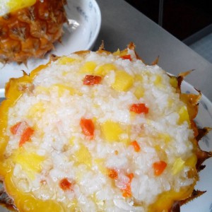 糯米饭蒸好后放入适量的白砂糖和菠萝肉,果汁,枸杞,葡萄干拌匀后盛进挖空的菠萝中上火再蒸十五分钟