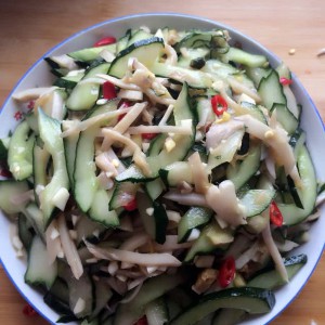 将黄瓜片 杏鲍菇丝放入大盆中 各种调料放在一起拌匀 放入醋 适量盐 最后淋一点香油 拌匀装盘 即可食用 但冷藏半小时味道更佳