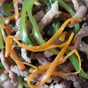 热锅,入油,油五分热时,倒入肉丝,炒散开至全部变色,加入胡萝卜丝,青椒丝,木耳丝,再加入2的调料,再炒一会儿就可以出锅了~因为妈妈不能吃辣,所以去掉了酸辣椒,如果喜欢吃辣的可以加在第2步中