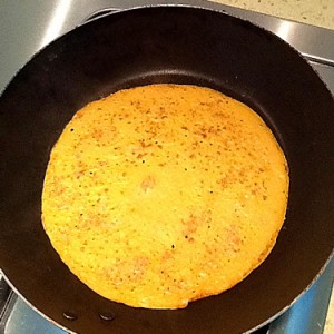 【入锅】用大汤匙舀一匙面糊倒入锅中,稍微转动使面糊糊均匀平铺在锅底。待锅中饼整体变色后,翻面煎烤另一面,两面都变色后,再煎2分钟左右,中间要不时转动、翻面。