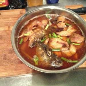 锅烧热,下入姜片、蒜瓣、八角、花椒、麻椒;豆瓣酱炒香后,加入适量温热水;待沸后,放入鱼片,煮至5-10分钟关火;