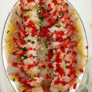 粉丝切断铺在盘底虾摆放在上面.抹上蒜蓉淋一点葱油汁上锅蒸10分钟.出锅洒上红椒粒葱粒热油4勺淋上去.再加一次葱油汁就行了