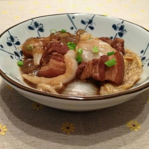 起锅少油,放入冰糖熬至微微冒泡,放入五花肉翻炒上色。