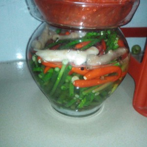 凉干之后在放进坛子,盖上盖在坛子凹槽里放水,放一个星期就大功告成,注:在发酵期间不要开盖。