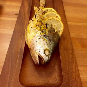 鱼去掉内脏、鱼鳞洗干净后用盐抹匀整条鱼身腌渍半小时,柠檬削皮切丝、剩余的切片。