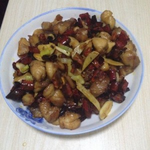 喜欢辣的朋友可以多放辣椒段.辣椒段.麻椒煸炒.出香味.放葱.姜丝.蒜片.鸡丁下锅.调味.