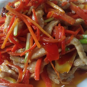 先炒肉,捞出,然后放姜酸,糟辣椒,胡萝卜,在放炒好的肉。翻炒,一直到胡萝卜熟。