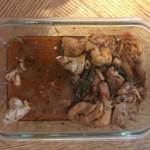 鸡腿肉切块,花椒碎和料酒、盐腌制