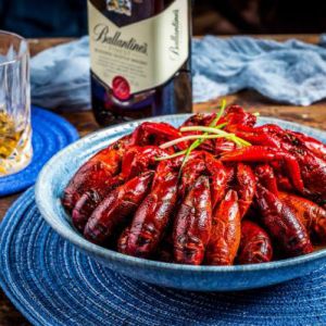 碗底盛入姜蒜辅料,龙虾围着摆盘。倒一杯威士忌,就可以享用了。